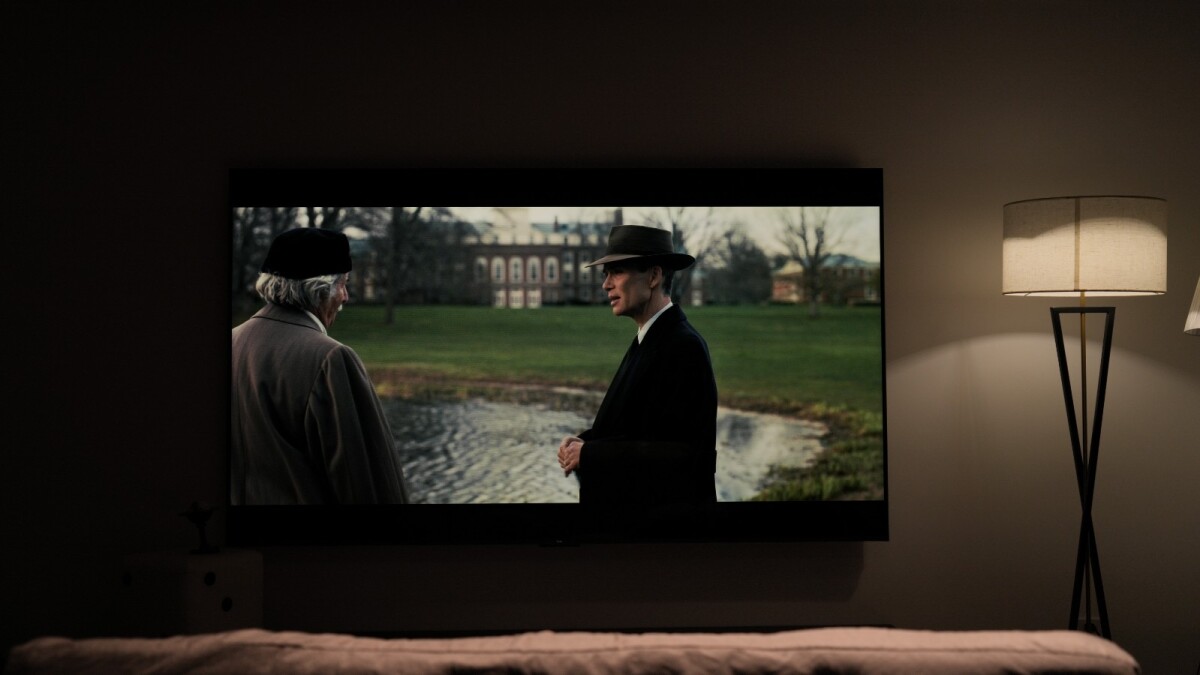 电影《奥本海默》全片用大量对话篇幅描绘人物细节,其中多数场景以灰暗的画面为主,家庭观影者的客厅往往环境光复杂,屏幕反射的杂光就很有可能在画面暗部形成影响观感的倒影。